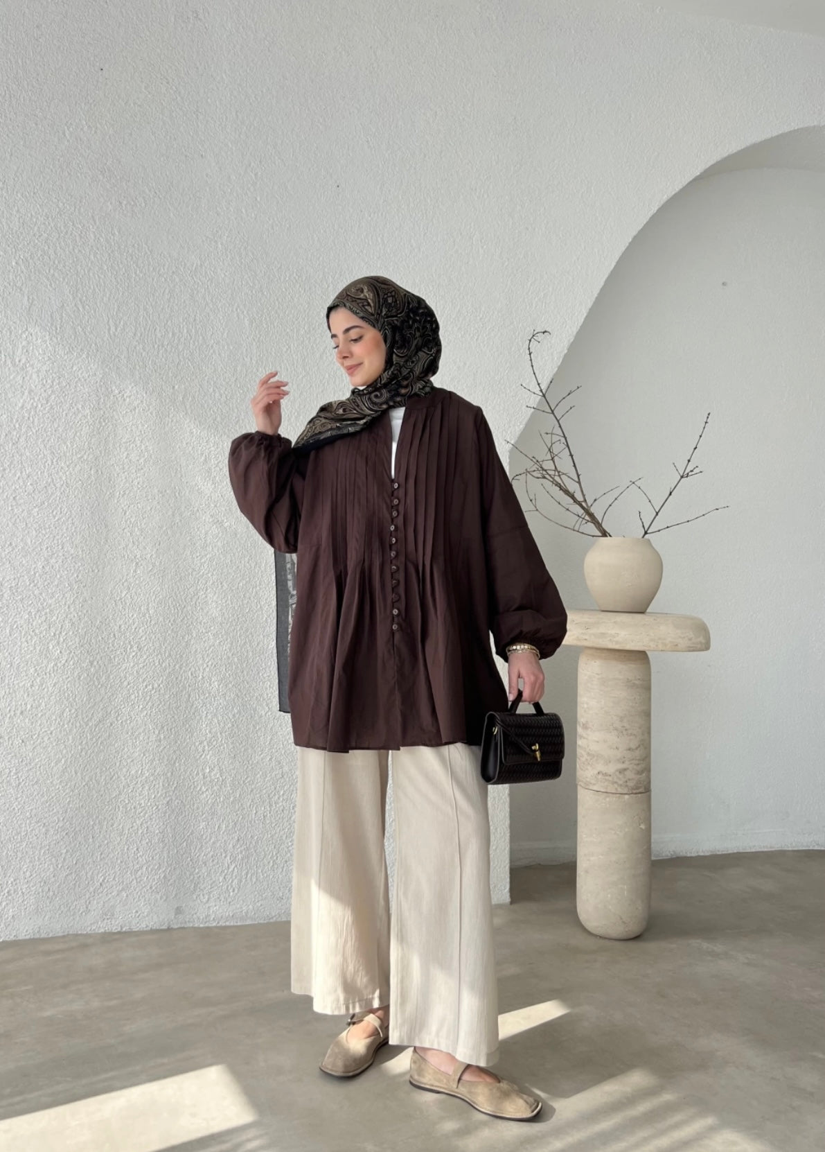Die Bluse in braun besteht aus feinem Baumwoll-Voile – ein besonders leichter Stoff, der sich fast schwerelos auf der Haut anfühlt. Sie wird mit einem passenden Gürtel geliefert und sorgt für einen luftigen, angenehmen Tragekomfort.