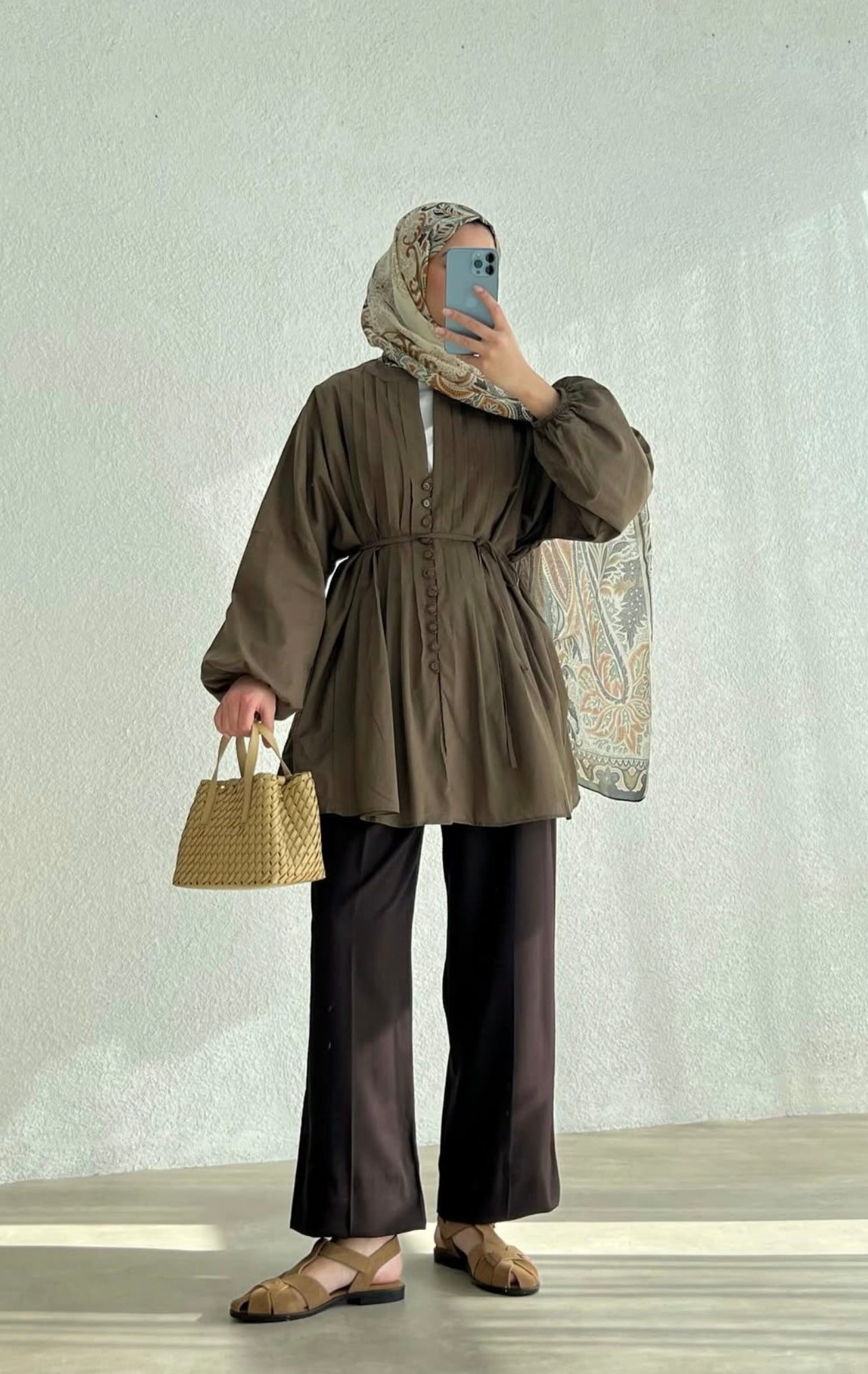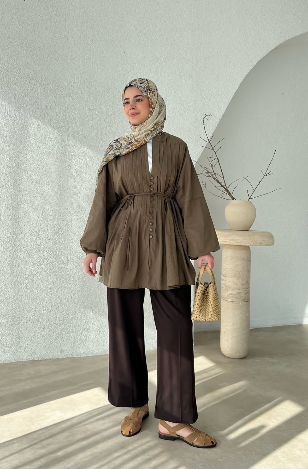 Die Bluse in dunkel Khaki besteht aus feinem Baumwoll-Voile – ein besonders leichter Stoff, der sich fast schwerelos auf der Haut anfühlt. Sie wird mit einem passenden Gürtel geliefert und sorgt für einen luftigen, angenehmen Tragekomfort.