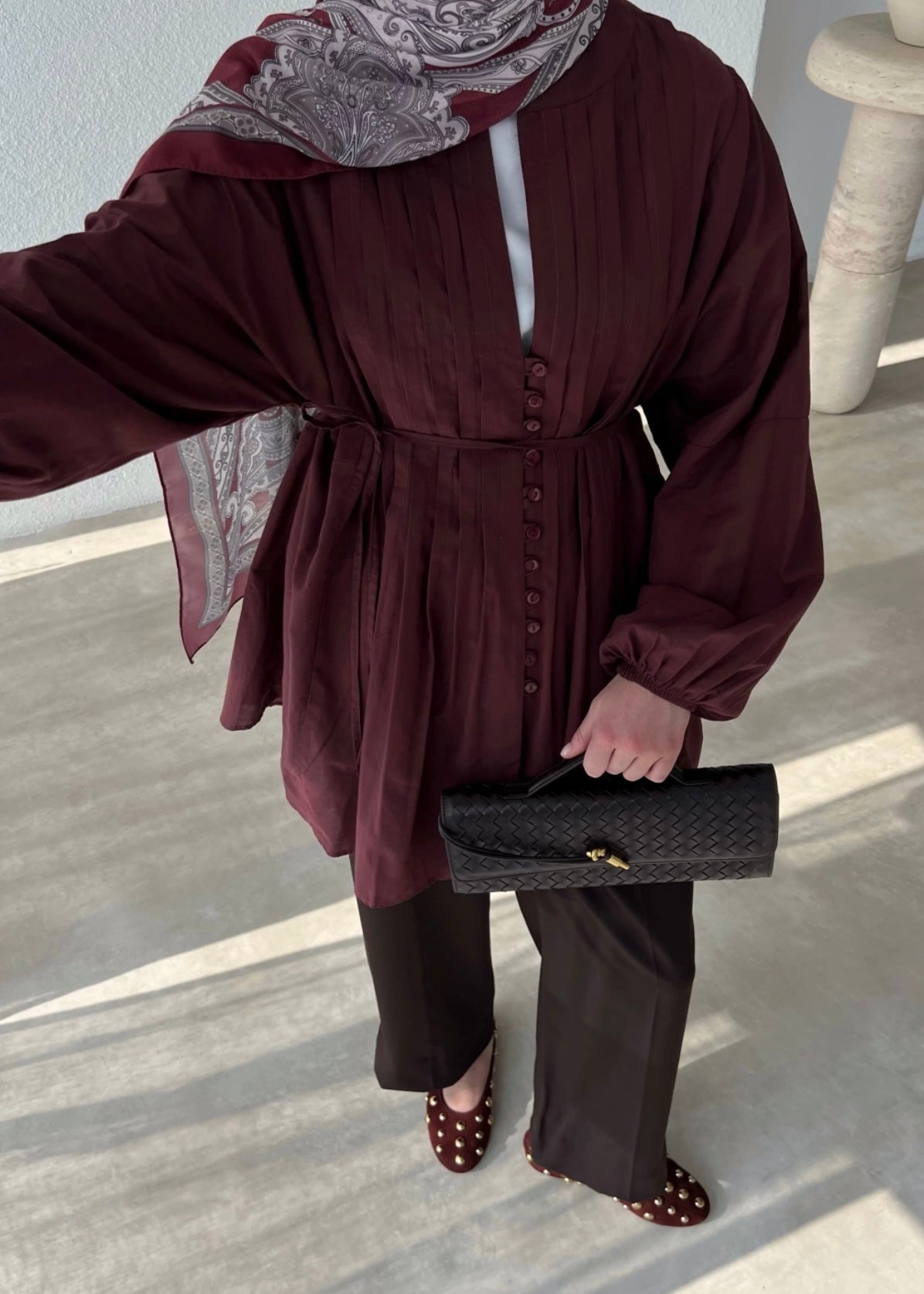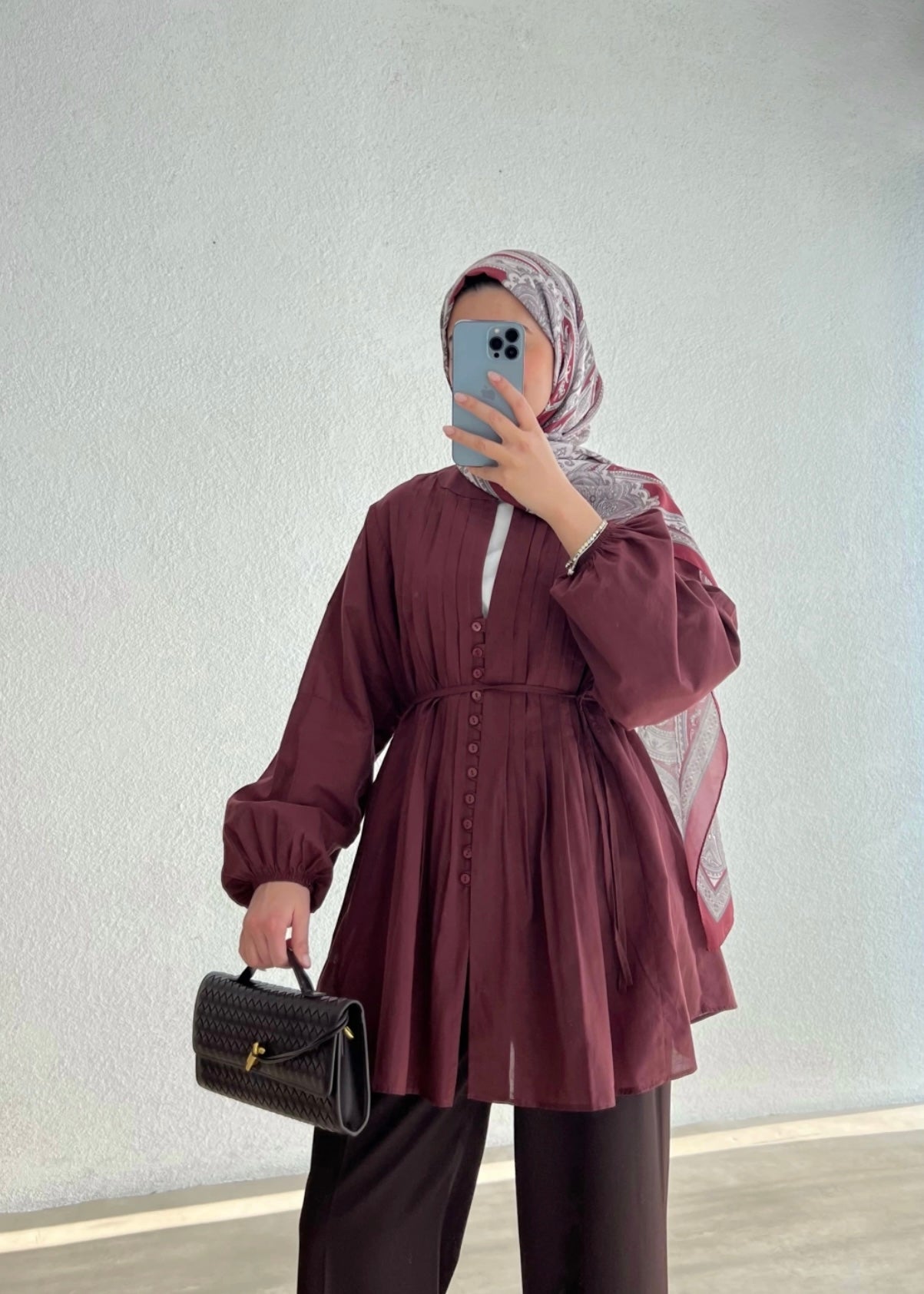Die Bluse in weinrot besteht aus feinem Baumwoll-Voile – ein besonders leichter Stoff, der sich fast schwerelos auf der Haut anfühlt. Sie wird mit einem passenden Gürtel geliefert und sorgt für einen luftigen, angenehmen Tragekomfort.